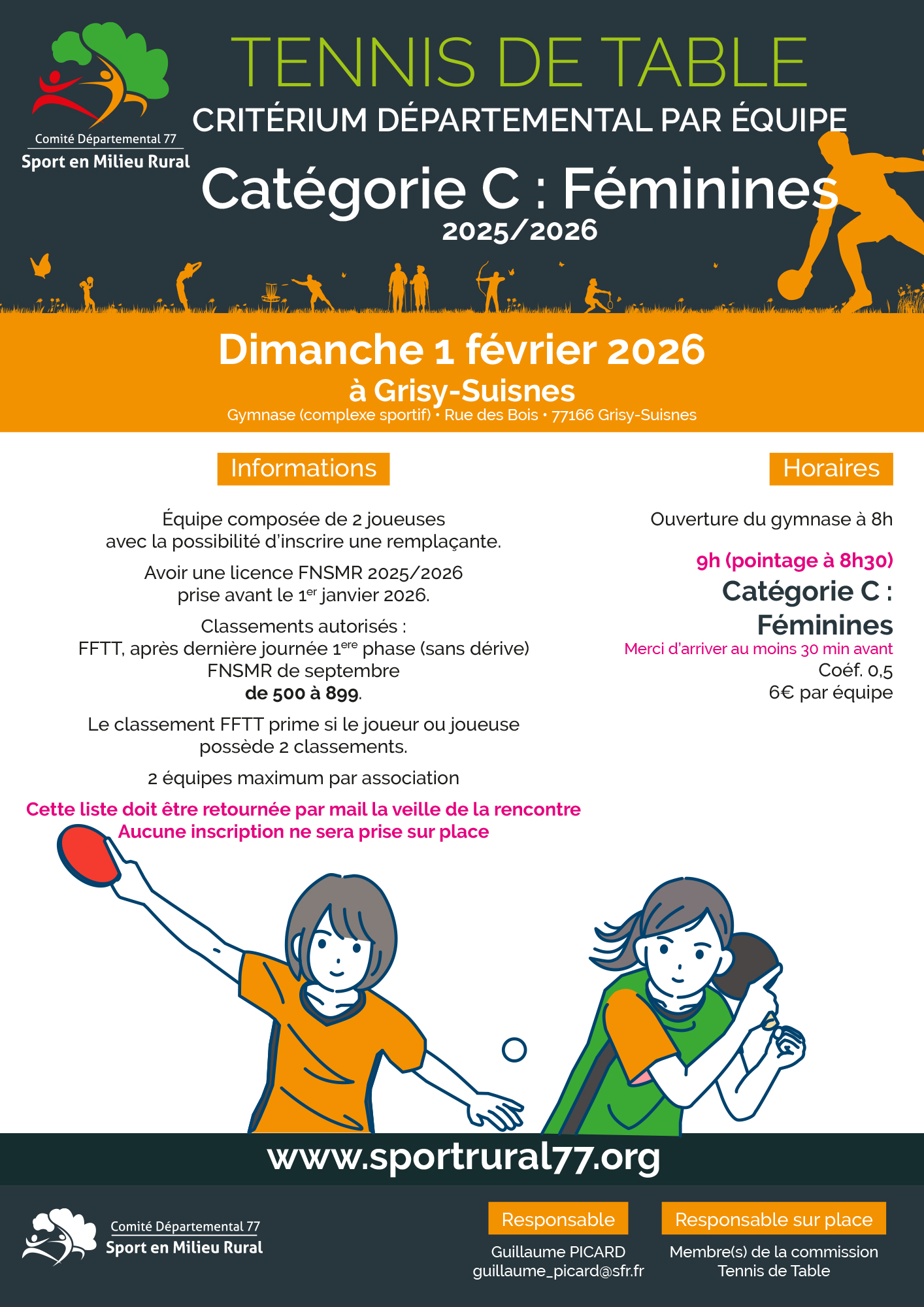 CDSMR 77 Mise à jour de l'article : 29 déc. 2025, 23:19 CRITÉRIUM DÉPARTEMENTALPAR ÉQUIPECatégorie C : Féminines Dimanche 1 février 2026 à Grisy-Suisnes Affiche Inscriptions (PDF)
