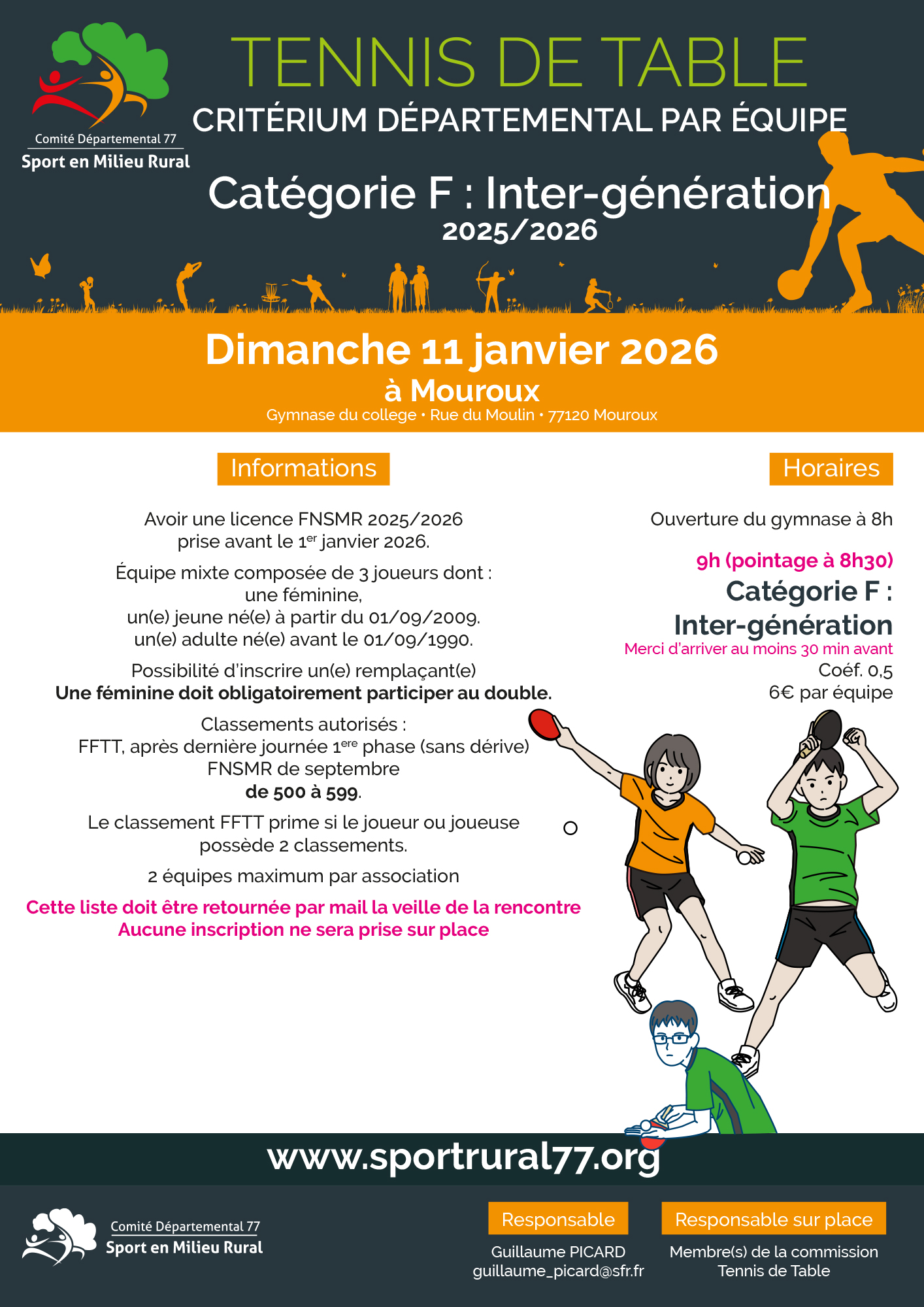 CDSMR 77 Mise à jour de l'article : 15 déc. 2025, 10:51 CRITÉRIUM DÉPARTEMENTALPAR ÉQUIPE Catégorie F : Inter-génération 2025/2026 Dimanche 11 janvier 2026 à Mouroux Affiche Inscriptions (PDF)