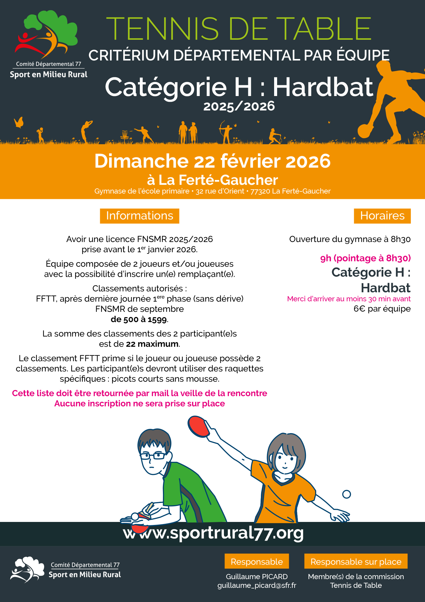 CDSMR 77 Mise à jour de l'article : 16 janv. 2026, 14:21 CRITÉRIUM DÉPARTEMENTALPAR ÉQUIPECatégorie H : Hardbat Dimanche 22 février 2026 à La Ferté-Gaucher Affiche Inscriptions (PDF)